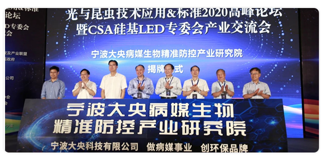 大央科技作为CSA联盟的重要成员,有幸承办此次《光与昆虫技术应用与标准2020高峰论坛暨CSA灭蚊灯标准专题会议》,在峰会上宣布成立了宁波大央病媒生物精准防控产业研究院,并进行了揭牌仪式,目前研究院已获得国内知名的江风益院士、李晋闽主任、戈峰主任的肯定。